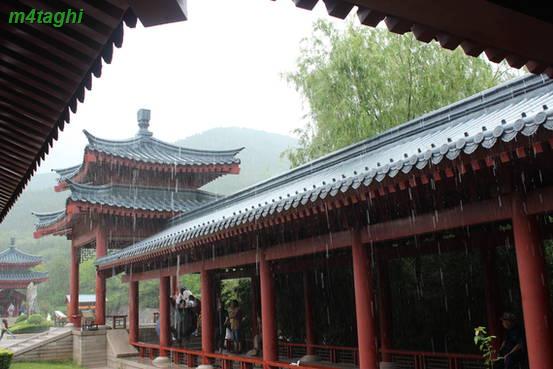 حدود یک و نیم ساعت بعد به منطقه ای سرسبز و کوهستانی میرسیم و راننده ما را پیاده میکند. باران تازه شروع شده و درفاصله کوتاهی که از درب ورودی به جایگاه خرید بلیت برسیم، بغض آسمان میترکد و دلش را یکباره خالی میکند و حالا نبار و کی ببار.... بلیت هشتاد یوانی مجموعه را خریداری کرده و همانجا سرپناه میگیریم.