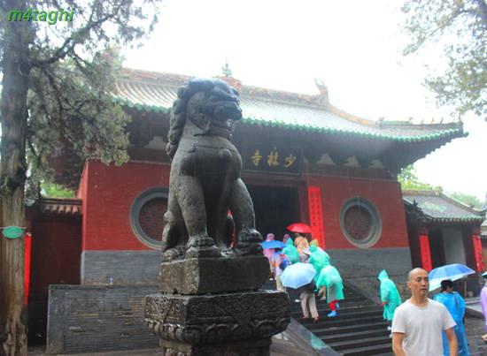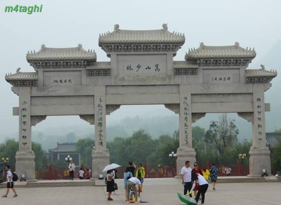 بعد از حدود نیم ساعت پیاده روی، به محوطه ورودی معبد شائولین میرسیم. مثل همه معابد چینی عمارتی سرخ رنگ با شیر سنگی محافظ!