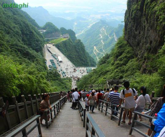 از کوه تیانزی تا انتهای مسیر با اتوبوس پایین می اییم. اتوبوس در آخرین ایستگاه خود که بالای صخره صداژدهاست ما را پیاده میکند. ساعت شش غروب است. برای پایین آمدن دو راه است یا آسانسور که در عرض دو دقیقه ما را به پایین میرساند یا پای پیاده... و از روز روشنتر است که ما کدام راه را انتخاب میکنیم..