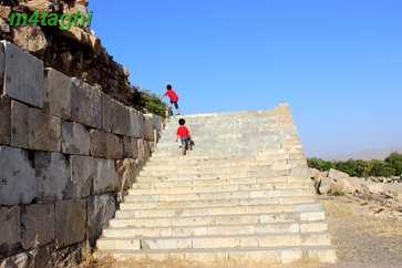 در ورودی معبد دو ردیف پلکان به حالت قرینه به چشم میخورد؛ یک ردیف 26 پله و ردیف دیگر 21 پله سنگی دارد بین سنگها هیچ ملاتی به کار نرفته و با بستهای آهنی و سربی به هم وصل شده اند. از پله ها عبور و خود را بر فراز تپه باستانی کنگاور میرسانیم. تپه ای که قسمت اعظم آن، قرنها در زیر آواری از فراموشی و فقر مدفون گشته بود