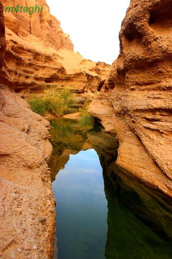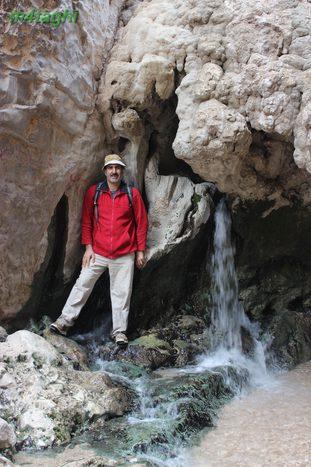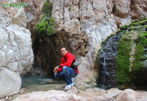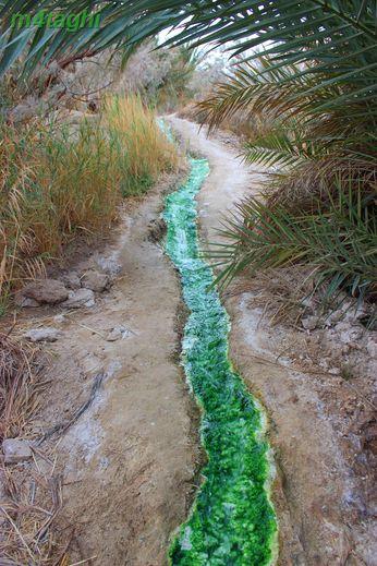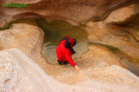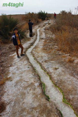 وقتی به پای تپه میرسیم دو جوی به رنگ سبز و سفید میبینیم که از تپه سرازیر میشوند و دوان دوان به استخری طبیعی میپیوندند. رد جویها را میگیریم و بالا و بالاتر میرویم. جویها به موازات هم جریان دارند و به دلیل املاح موجود در آب، رسوبات زیبایی در بسترشان پدید آمده.
