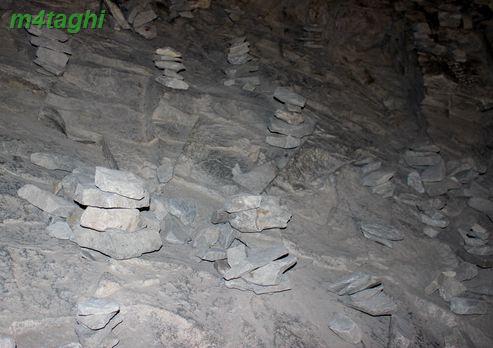 درون غار پر است از سنگهایی که روی هم چیده شده اند. گویا سنگچین کردن یکی از ارکان مهم زیارت غار است. هرکدام از این سنگ چین ها نمایانگر یک آرزو و مراد است، باشد که این سنت و رسم دیرینه که با اعتقاد قلبی مردم گره خورده بتواند گره گشای مشکلی و شفابخش دردی باشد.