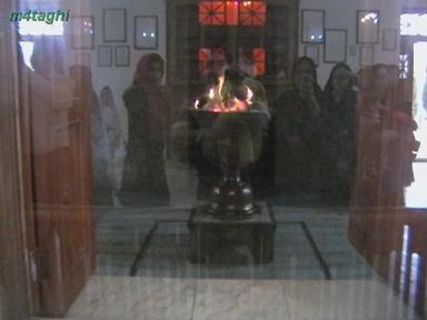 وارد آتشکده میشویم دیوارهایش را با تصاویر زرتشت و جمله هایی از کتاب مقدس اوستا آذین کرده اند.آتش مقدس درون مجمر بزرگی از جنس برنز،فروزان است و فردی ملقب به «هیرید » مسئول روشن نگه داشتن آن.بازدیدکننده ها از پشت شیشه آن را به نظاره ایستاده اند چرا که آتش پاک نباید با نفسهای آدمی در هم آمیزد.